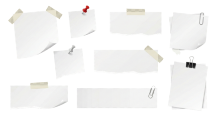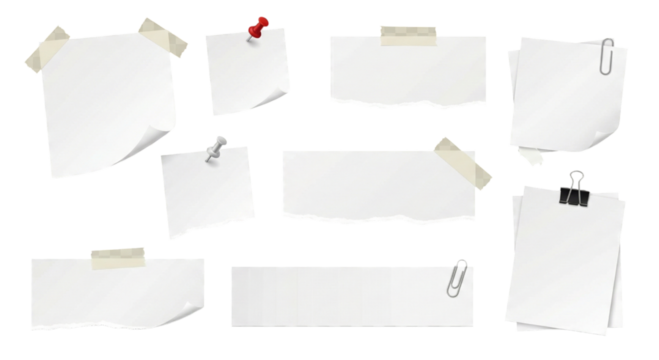 Arrangement of blank notes with clips and tape isolated on transparent background