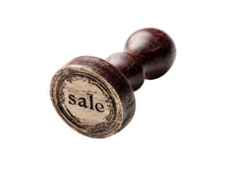 Vintage wooden stamp with sale text for business promotions on a transparent background, cut out