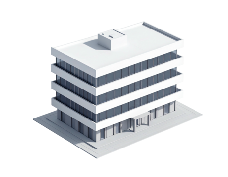 Modern, symmetrical architectural rendering of a multi-story building, white facade, glass windows
