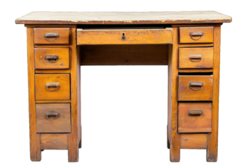 Vintage wooden desk with multiple drawers, featuring a rustic design ideal for home offices or creative workspaces.