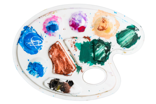 ultra-detailed macro shot of a used artist's palette holding thick, wet blobs of vibrant oil paint and scattered, stained brushes on a pristine white background, shallow dof. Concept of hands-on