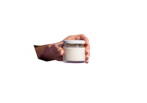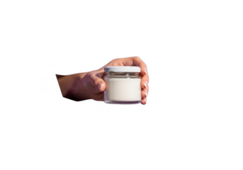 Hand holding a small glass jar filled with white cream isolated on transparent background