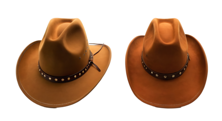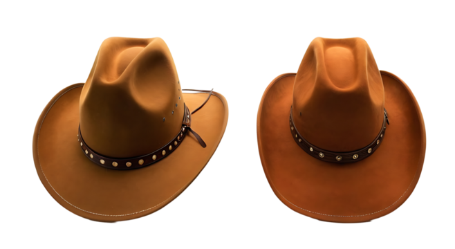 Two brown cowboy hats with studded leather bands. Transparent PNG for versatile use. Perfect for Western, rodeo, or costume party themes.