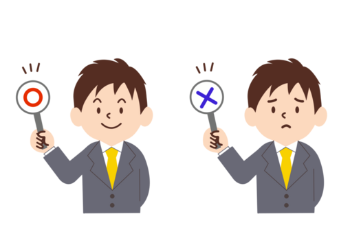 マルとバツを出すビジネスマン スーツを着た男性のイラスト シンプル,かわいい,ビジネスパーソン,丸バツ