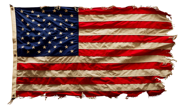 Worn US flag, tattered edges, white background, patriotic