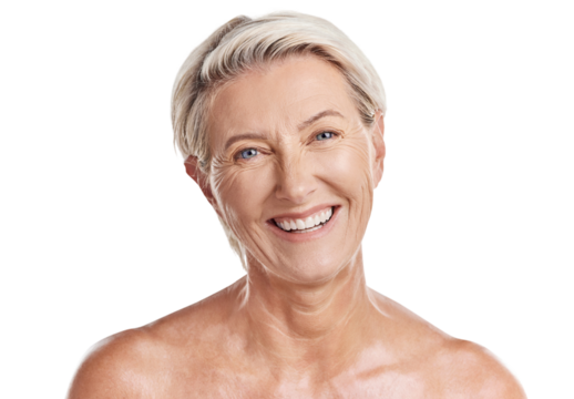 Portrait of a mature woman with a gentle, kind smile, her eyes radiating warmth and the depth of her life experiences, isolated on a transparent background