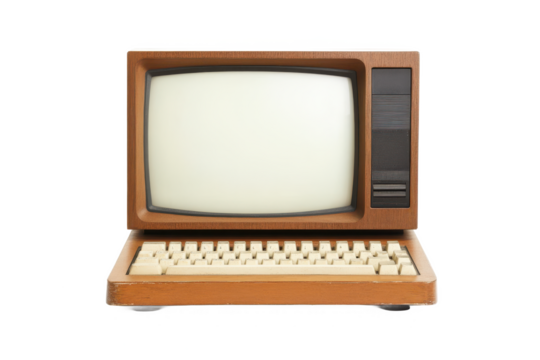 Vintage personal computer monitor and keyboard from the 1980s era isolated on transparent background