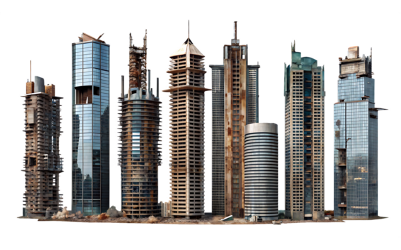 set of ruined skyscrapers isolated on white background PNG. GENERATIVE AI