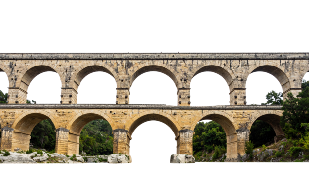Ancient stone aqueduct with multiple arches over rocky terrain and green foliage