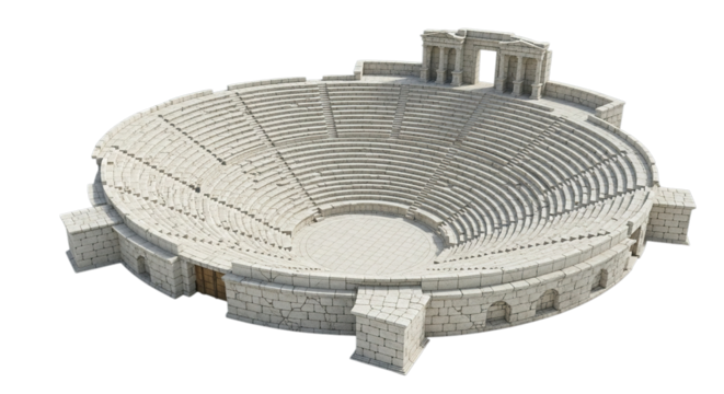High angle view of an ancient amphitheater with stone seating isolated on transparent background
