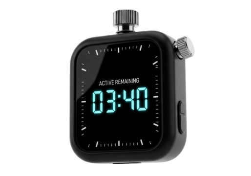 hyper-realistic cgi render of a floating matte black ceramic digital stopwatch. silver crown, cyan-blue '03:40' oled display, sharp rim light against a transparent studio background. concept of