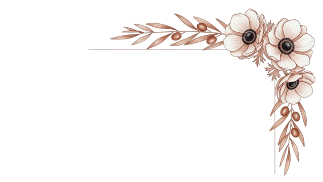 Delicate minimal watercolor corner element featuring anemones and olive branches in terracotta isolated on white background