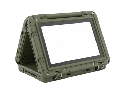 A rugged, heavy-duty military clamshell computer, closed, olive drab green, reinforced, sealed ports, blank screen, on transparent studio background with high-key lighting, concept of robust military