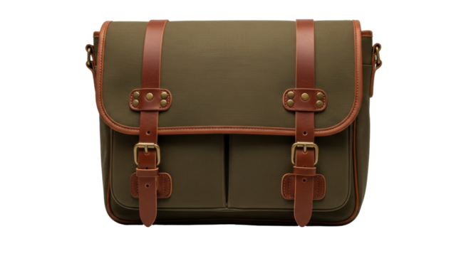 Isolated olive-green canvas messenger bag with brown leather trim and straps for daily use