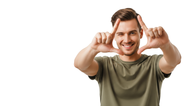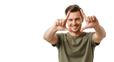 Handsome young caucasian man winks, making a finger frame in an olive t-shirt against a transparent studio background with empty copy space. Concept of vision and perspective