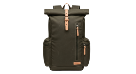 Isolated rucksack with roll-top closure and pockets in green-brown for travel or carrying things