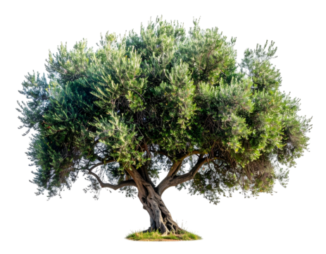 Lush, isolated olive tree with gnarly trunk and dense green foliage