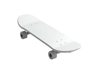 White skateboard angled on a black background, red wheels, clean minimalist design