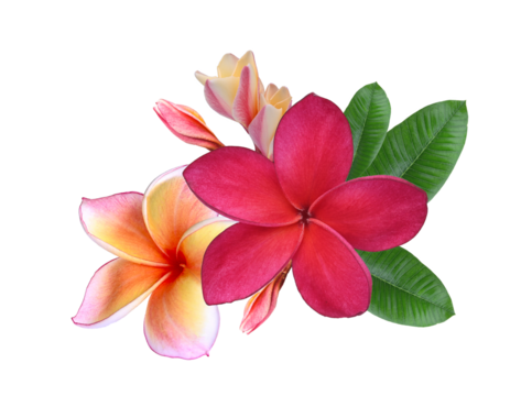 Vibrant red and orange plumeria (frangipani) flowers, both blooming and budding, growing in a lush green leafy cluster   om transparent.