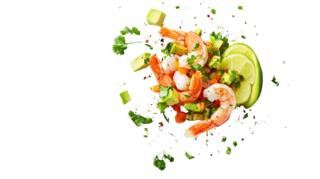 fresh shrimp ceviche with lime cilantro and avocado om white background