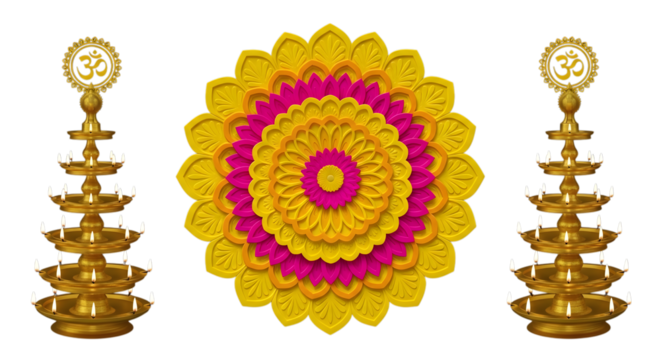 Traditional indian brass oil lamps and floral decoration isolated on transparent background