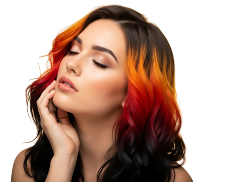 Beautiful young woman with vibrant ombre hair coloring featuring shades of fiery red and bright orange against a pure transparent background, posing elegantly with eyes closed