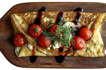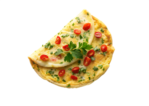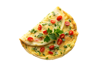 Delicious omelette with cheese, chives, and red pepper isolated on transparent background