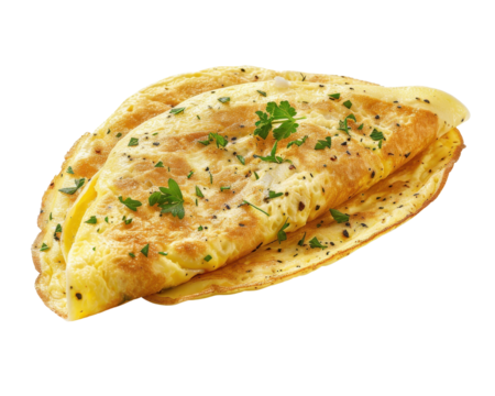 Deliciously cooked fluffy omelette garnished with fresh herbs, perfect for breakfast or brunch. Golden brown texture and appetizing presentation.