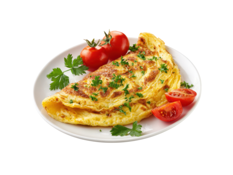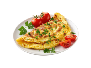 Golden omelette with fresh parsley and cherry tomatoes image, Isolated, Transparent Png