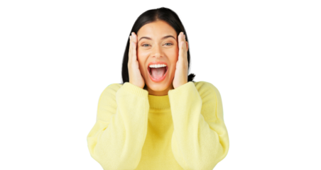 Surprise, wow portrait and woman for news, announcement and information. Excited, happy and face of a young girl smile with shocked and omg or crazy scream isolated on a transparent png background
