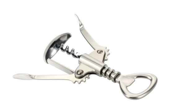 Winged corkscrew wine opener, silver metal on black background