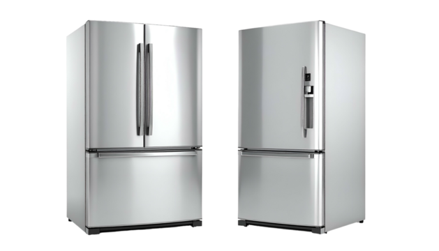 Two stainless-steel modern refrigerators stand side-by-side on a blank background