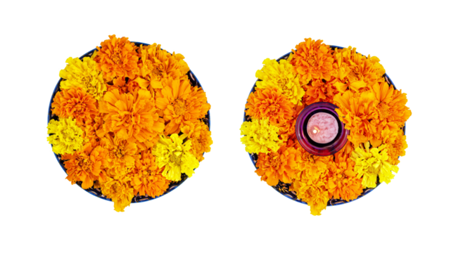 Bowl with yellow and orange color marigold flowers and candle. Altar. Flowers for Indian holidays Diwali festival, Pongal and Day of the Dead. Flat lay, Isolated on a transparent background