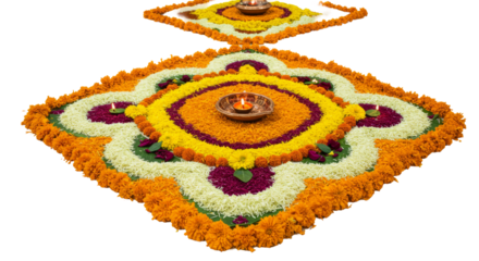 The Indian festival of Onam features a mandala made of flowers and leaves with a transparent background