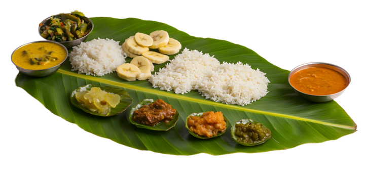 Traditional South Indian Feast Served on a Fresh Green Banana Leaf Isolated on White Background for Festivals and Celebrations