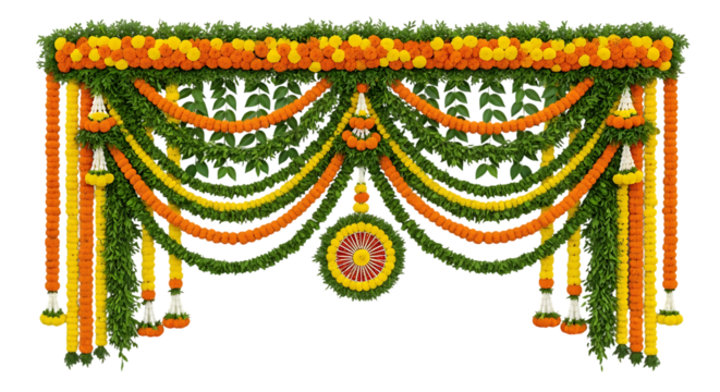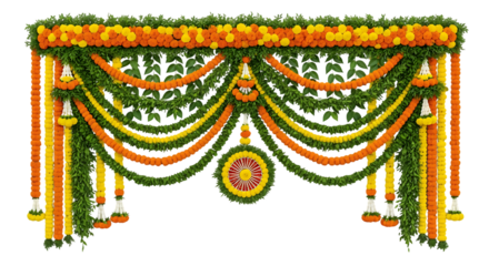 Wedding and festival decoration with marigold flowers Toran design door hanging isolated on transparent background