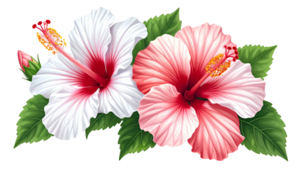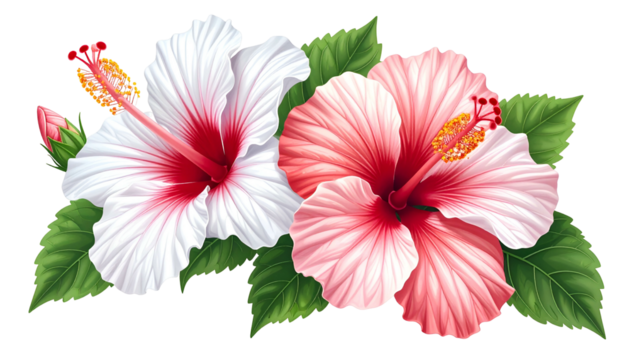 Rendered tropical flowers, one white and one pink, with leaves and buds
