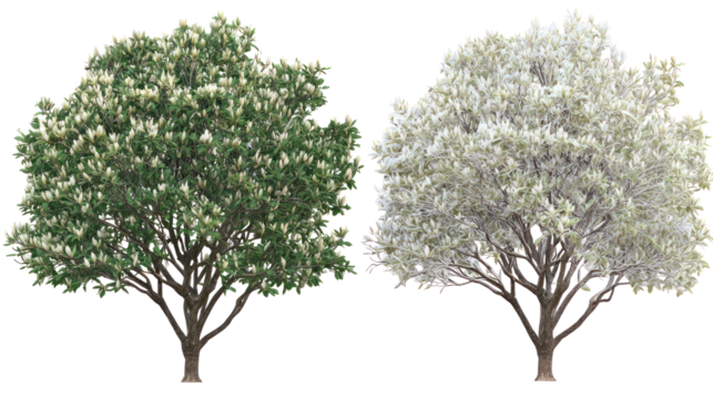 Two same magnolia trees side by side one representing summer and winter on transparent background