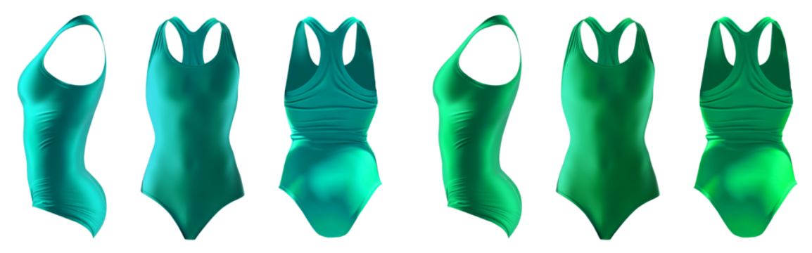 2 Set of turquoise blue green front back side view, one piece racerback round neck classic silhouette swimsuit swimwear bodysuit leotard on transparent cutout PNG. Mockup template for artwork design