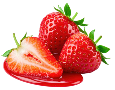 Three juicy strawberries, one whole and two halved, showcasing their vibrant red color and seeds. background removed