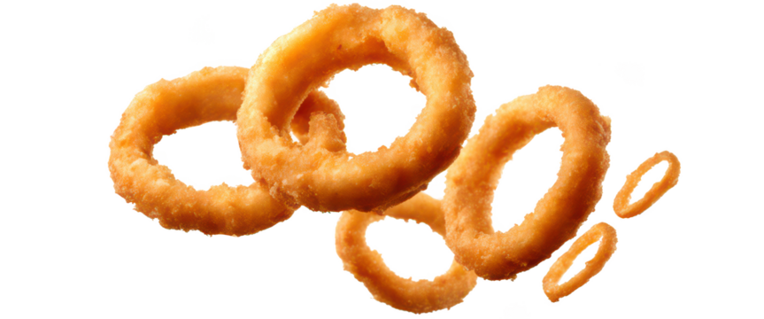 A Tower of Golden Crispy Onion Rings on a White or Clear Surface PNG Transparent Background.