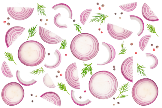 Red Onion and Green Scallions with Slices, Fresh Produce, isolated on transparent background