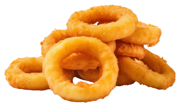 A neat pile of battered onion rings with their golden-brown crust illuminated perfectly, transparent background
