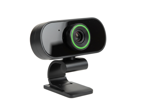 Black digital webcam with HD lens and microphone for video conferencing, online communication, and streaming, modern technology, isolated on transparent background