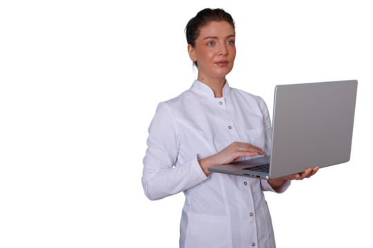 Female doctor using laptop for telehealth consulting, standing smiling, medical professional on transparent background
