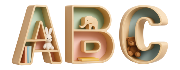 Alphabet-shaped shelves that help in learning letters while organizing books and toys in a playroom.