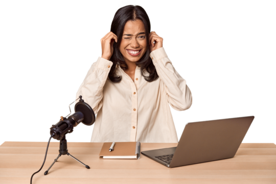 Woman records podcast with laptop covering ears with hands.