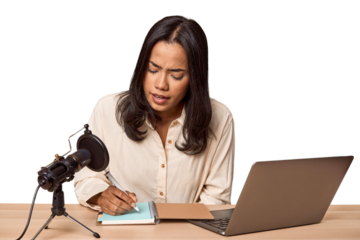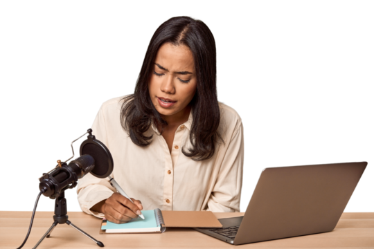 Filipino woman podcasting with mic and laptop