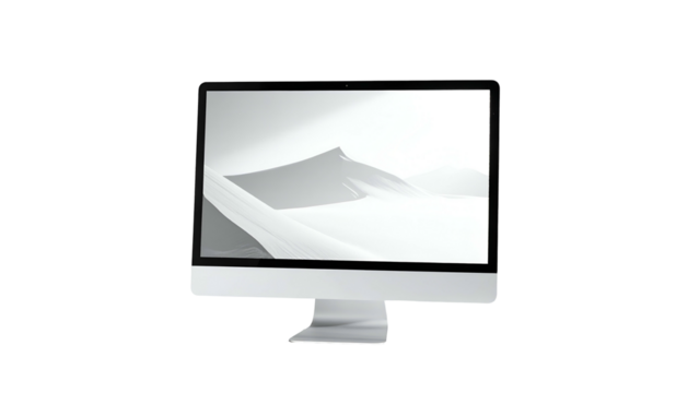 Sleek silver computer display shows monochromatic landscape against a black background