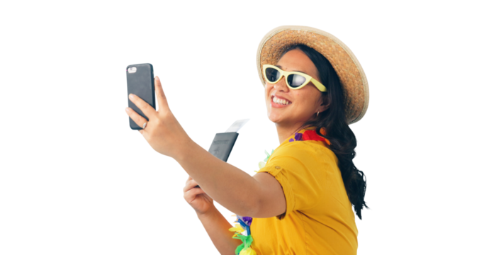 Selfie, happy and man with passport or tickets, trip and memories of summer vacation. Brazil guy, smile or profile picture of holiday with travel itinerary or isolated on a transparent png background